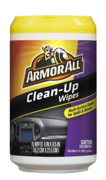 Armor All Multi Surface Clean Up Wipes (15 Count) Spills happen, so grab Armor All Clean Up Wipes to clean them up quickly and efficiently. These convenient, disposable car cleaning wipes lift away everyday messes to make quick work of clean-up. These Armor All wipes are safe on automotive surfaces like vinyl, plastic and fabric, so you can use a wipe as a seat or dashboard cleaner without causing fading or drying. They also won't leave greasy residue on interior surfaces or on hands. Store this conveniently sized canister of wipes in your glove box or drink holder to keep these handy automotive wipes within reach whenever you may need them.