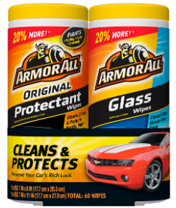 Armor All Original Car Protectant and Car Cleaning Wipes ( 2 - 30 Count Packs) Grab this combo pack of Armor All Original Car Protectant and Car Cleaning Wipes to keep your car fresh and clean with convenient auto care products. Armor All Original Protectant Wipes protect and preserve your car's look by preventing cracking, fading, discoloration and premature aging. Armor All Cleaning Wipes are lint free interior car wipes that easily remove ground-in dirt from all car surfaces. The cleaning car interior wipes leave a natural, matte finish on your car surfaces, and the protectant leaves a medium shine. Both types of disposable wipes are lint free and don't leave greasy residue on your hands for worry-free cleaning anytime. Simply rub the auto protectant wipes on dirty surfaces for quick, convenient cleaning. Keep the auto cleaning wipes in your car for easy cleaning. Help keep your car looking and feeling like new with Armor All.