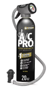 A/C Pro ACP-100 Ultra Synthetic R-134a Car Refrigerant Kit - 20 OZ A/C Pro ACP-100 Professional Formula Ultra Synthetic R-134a Car Refrigerant Kit helps make recharging your car’s AC easy and accessible. This auto AC recharge kit features an additive formula that seals leaks in rubber hoses, gaskets and O-rings, and protects your AC system while providing 2x cooling boosters, versus the next leading brand of AC recharge kits. Each R-134a refrigerant kit helps eliminate acid and moisture buildup to protect and extend the AC system’s life. This AC leak sealer comes with a reusable, extra-long braided AC charging hose and AC gauge for easy, convenient and accurate recharging. To use, find the low-pressure port, turn on the car and AC, read the pressure, and charge the system. Feel empowered to take on DIY car care, and refill the chill yourself with A/C Pro. This item contains R-134a.