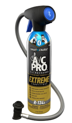 A/C Pro Extreme Conditions Smart Charge AC Recharge Kit helps make recharging your vehicle's air conditioner easy and affordable. This car AC leak sealer includes a proprietary formula that seals rubber leaks in O-rings, gaskets and hoses, and protects your AC system while providing 2 times cooling boosters, versus the next leading brand of automotive AC refrigerant recharge kits. This AC refrigerant features a digital AC gauge that uses Smart Charge technology, with a reusable trigger-style dispenser that wirelessly connects to your smartphone using Bluetooth technology through the A/C Pro app (available on the Apple App store and Google Play) to provide you with guided, adaptive vehicle specific instructions to help eliminate guesswork during the recharge process. Each A/C refrigerant uses a robust ingredient combo designed to withstand high pressure seen with frequent AC stops and start-ups, as well as protect against extreme temperatures and high use. This AC refrigerant recharge kit also comes with an AC recharging hose for easy use. checkmark "This AC recharge is formulated to help produce colder air and extend AC system life"