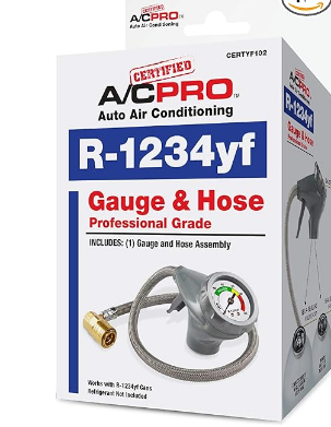 Certified A/C Pro R-1234yf Gauge and Hose Professional Grade dispenser features an extra-large gauge, easy-to-use trigger dispenser, 24 inch hose, and a quick-connect R-1234yf coupler. The gauge is able to diagnose if a recharge is needed, identify the current low-side pressure in the system, and determine increases in pressure during the recharge process. This product is compatible with both sealed and self-sealing R-1234yf cans.
