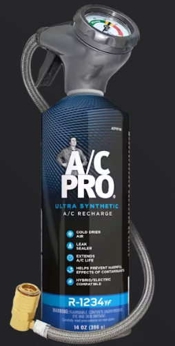 A/C Pro® R-1234yf Ultra Synthetic A/C Refrigerant Recharge Kit is formulated with special additives to provide colder, drier air and improve refrigerant performance within the A/C system. The advanced formula features excellent leak sealing ability to quickly seal common A/C leaks in rubber O-rings, gaskets, and hoses, and it extends the vehicle’s A/C life with anti-wear additives that prevent the effects of harmful contaminants, such as oxygen. To use, simply find the low-pressure port, measure the system and charge using the attached recharge hose. An easy-install snap-lock coupler and reusable gauge help make charging easy. This refrigerant is compatible with all R-1234YF vehicles including hybrids and electric vehicles.