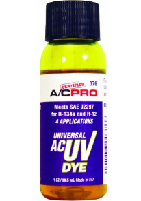 This larger size universal A/C system UV leak detection dye contains four applications. It can be used with all R-134A, R12 and R22 systems and is compatible with all PAG, ester, and mineral based refrigerant oils. Meets SAE J2297 specification. Easy to see with UV light or contrasting ambient light background. Cleans the suspected area of leak best as possible for optimal performance.