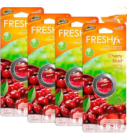 Armor All FRESH fx Car Air Freshener Vent Clip features Odor Elimination Technology. Odors are destroyed providing a refreshing burst of fragrance to match your scent preference. Cherry Blast scent features notes of juicy, sweet cherry and apple burst into a heart of red berries.