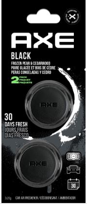 AXE Mini Vent Clip Car Air Freshener (Black Scent, 2 Pack) Simply clip the mini vent car air freshener onto your car’s vents to help you control the freshness of your ride wherever you are. Its sleek, circular design – which features a recyclable, hard-wearing ceramic core – is available in seven genuine AXE fragrances and is ideal for those looking for a discrete car air freshener that releases a fresh and elegant aroma. The fragrance core is the secret to this high performer. It’s able to absorb a high level of fragrance, and releases it evenly and slowly for up to 30 days* in your vehicles interior. The back case allows the air from the vents to pass through easily, releasing the fragrance in the cabin. The POM clip allows a snug fit to each vent. The mini car vent fresheners might be small, but they pack a real fragrance punch!Now, the best AXE fragrances have been transformed into an enticing range of scented car air fresheners to keep your ride clean and cool! Developed in different formats including scented discs, mini vents, and gel cans, there’s an AXE car air freshener that’ll boost your confidence no matter what state your car is in! All are available in six of the most iconic AXE fragrances. Securely sealed for 100% protected freshness, each AXE car air freshener is perfectly infused to ensure slower, long-lasting scent release, so you and your ride stay fresher for longer! Our sealed car air fresheners offer a 100% invigorating scent every time, guaranteeing your favorite fragrance lasts longer. You’re welcome! AXE mini car vent fresheners are a discrete car air freshener that releases a fresh and elegant aroma Simply clip the mini vent car air freshener onto your car’s vents to help you control the freshness of your ride POM clip allows a snug fit to each vent Sleek, circular design features a hard-wearing ceramic core and is recyclable Calcium Silicate core absorbs a high level of fragrance, and releases it evenly and slowly for up to 30 days* when used as directed Polypropylene back case allows the air from the vents to pass through easily, releasing the fragrance in the cabin
