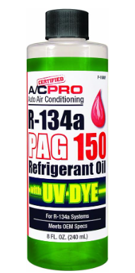 PAG 150 UV is a high viscosity refrigerant oil for R 134A automotive air conditioning systems with a UV leak detector dye. Find leaks easily with UV dye and ultraviolet light or high contrast ambient light. PAG 150 meets OE specifications and is ISO 150 viscosity. Comes in a easy to use 8 ounce bottle. Always confirm factory capacity information prior to filling.