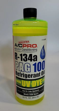 A/C Pro R-134A - PAG OIL 100 U/V DYE P-100UVQT- 32 OZ. (1 QUART) BOTTLE Refrigerant Oil; R134A; 1 Quart; Medium Viscosity Oil For R-134a Systems ISO 100 medium viscosity; Meets OEM specifications PAG Oil with UV DYE detects leaks with any leak detection system; Not for use in hybrid/electric vehicles with non-belt driven (electric driven) compressor.
