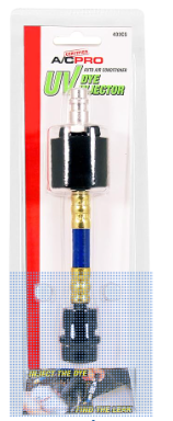 This handy tool is used specifically for injecting UV dye in to R-134A A/C systems. The injector nozzle is compatible with all R-134A recharge hoses and refrigerant. Injects one application at a time. Finds leaks easily using UV light or high contrast ambient light surroundings.