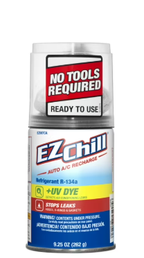 EZ Chill 134a with System Safe Leak Sealer + UV Dye (9.25 ounces) (CA Compliant) This EZ Chill refrigerant all-in-one kit has a specially designed formula of R-134a and additives. The 9.25 oz. of R-134a and additives are used to recharge a vehicle's A/C system, seal common leaks in the A/C system's rubber components, and identify any leaks that were too large to be sealed. The built-in recharge hose with push button dispenser provides an all-in-one, no tools required recharge solution. This item is ineligible for sale or shipping to WA/VT. This item contains R-134a.