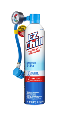 EZ Chill R-134a Refrigerant & Oil (18 ounces) (CA Compliant) This EZ Chill refrigerant kit has a specially designed formula of R-134a and additives. The approximately 15 oz. of R-134a and 3 oz. of additives are used to recharge a vehicle's A/C system and seal common leaks in the A/C system's rubber components. This A/C recharge kit comes with a reusable charging hose and gauge. This item contains R-134a.