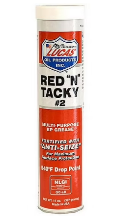 Lucas Red "N" Tacky Grease is a smooth, tacky, red lithium complex grease fortified with rust and oxidation inhibitors. It has good water resistance and washout properties. It has excellent mechanical stability and storage life. It is able to withstand heavy loads for extended periods of time. It can be used in many agricultural, automotive and industrial applications. Lucas Red "N" Tacky Grease is fortified with a high degree of extreme pressure additives that give it a TRUE Timken load much higher than other greases of this type. Its especially good for sliding surfaces and open gears.