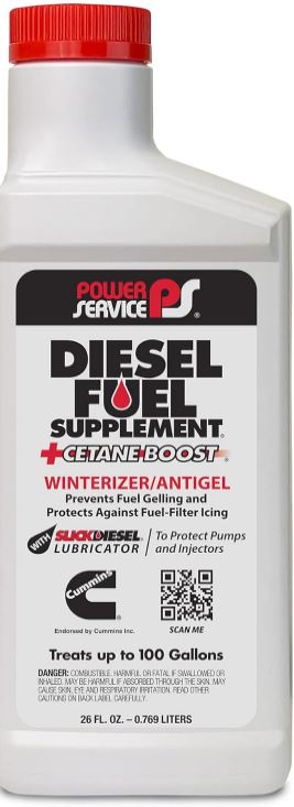 Manufacturer Power Service Brand Power Service Model Diesel Fuel Supplement Antigel Item Weight 12 pounds Package Dimensions 9 x 8 x 6 inches Item model number 1026-12 Manufacturer Part Number 1026-12| Power Service Diesel Fuel Supplement +Cetane Boost is a diesel fuel antigel, or winterizer, that is the go-to solution for diesel fuel in winter, especially when temperatures drop below 30 degrees Fahrenheit. It prevents diesel fuel gelling, protects against fuel-filter icing and is designed to keep your engine running smoothly, even through the toughest winter conditions, including subzero temperatures. Keep your diesel running trouble free all winter with Diesel Fuel Supplement, the only antigel endorsed by Cummins for use in all diesel engines. It is safe and effective for use in all diesel fuels, including Ultra Low Sulfur Diesel (ULSD) fuel and biodiesel blends.