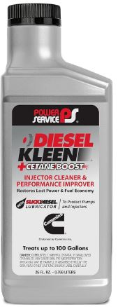 Manufacturer Power Service Brand Power Service Model Diesel Kleen and Cetane Boost Item Weight 12 pounds Package Dimensions 9 x 8 x 6 inches Item model number 3026-12 Manufacturer Part Number 3026-12 Diesel Kleen + Cetane Boost is a total injector cleaner and performance improver that cleans injectors, boosts cetane and lubricates fuel injection components. To realize the benefits of today’s cleaner-burning fuels, new technology is required to maximize performance. It restores lost power and fuel economy and smooths rough-running engines. Diesel Kleen can be used year-round, but it is not a diesel fuel winterizer or antigel. When winter temperatures drop below + 30°F. use Diesel Fuel Supplement +Cetane Boost (in the white bottle) to provide maximum winter protection for your diesel engine.
