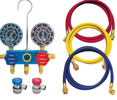 Certified A/C Pro Automotive Air Conditioning R-134a Manifold Gauge & Hose Set is used to check both low and high side pressures while adding refrigerant. This professional grade kit features SAE approved 72 inch hoses (blue low-side, red high-side), and 60 inch yellow charging hose. The manifold has low and high pressure gauges that can be recalibrated.