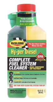Rislone® Hy-per Diesel⢠Complete Fuel System Cleaner improves the quality of Diesel fuel by increasing its cleaning ability, adding lubrication, removing contaminants, fighting corrosion, and helping to prevent the fuel from gelling & going bad. This one dual cavity bottle contains the same amount of additives equal to a bottle of regular injector & complete fuel system cleaner, anti-gel cold flow improver, fuel stabilizer & conditioner, Cetane booster & diesel treatment, ULSD sulfur substitute, and UCL pump & injector lubricant. Simply put, it is the best all in one diesel fuel additive money can buy.